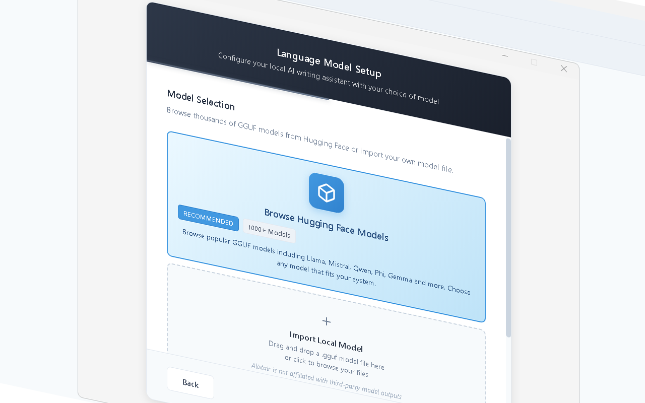 Import any GGUF-quantized model. Inference runs locally via llama.cpp with optional CUDA/Metal GPU acceleration.