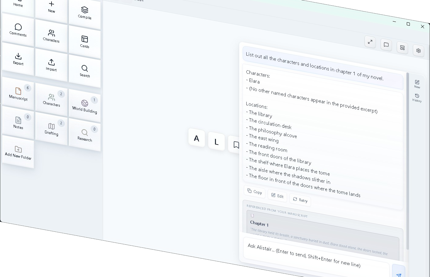 A conversational LLM chat interface that knows your actual manuscript. Ask about specific chapters, characters, or plot points and it retrieves real text from your prose, linking back to the source scene.