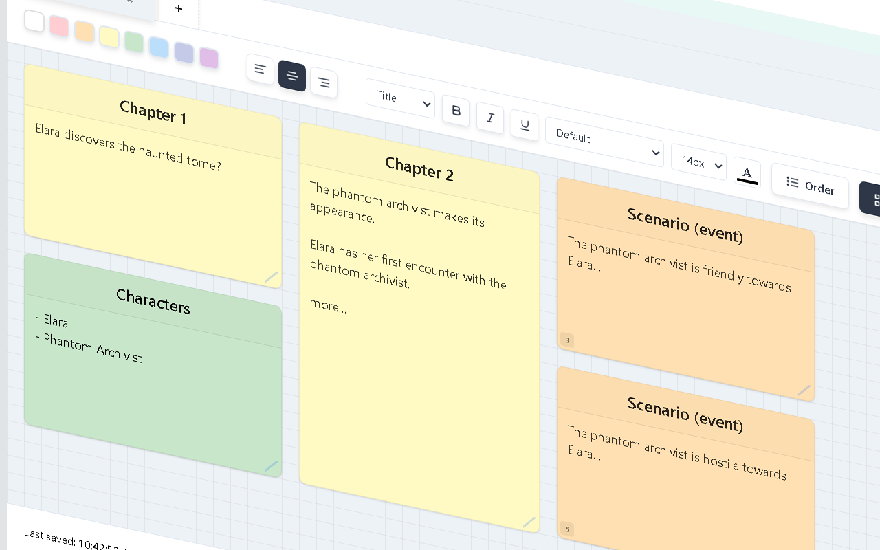 Capture inspiration, track subplot threads, and organize reference materials. Notes support the same version control and styling as chapters.