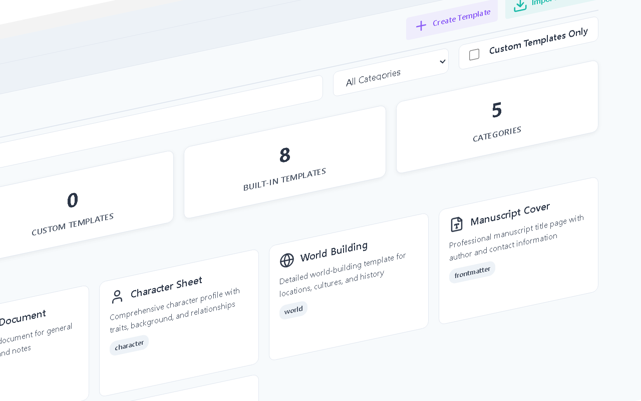 Develop immersive fictional worlds with structured templates for geography, cultures, history, and lore. Create custom document schemas when the built-in templates don't fit your genre.